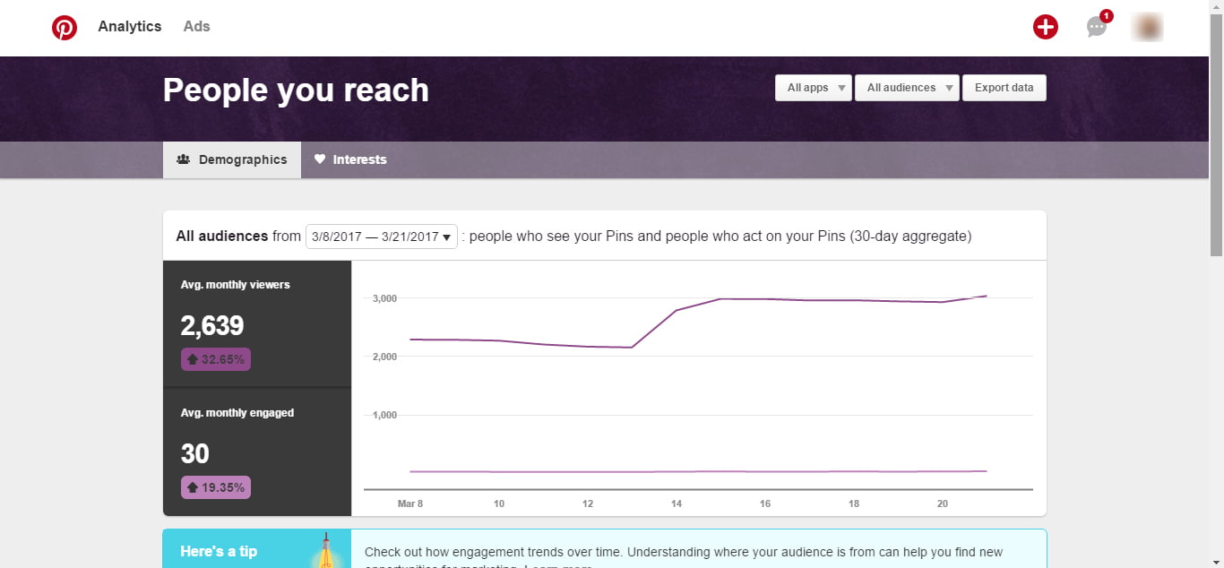 The “People You Reach” tab shows you demographic and interests data about the people that you have “reached,” which Pinterest is defining as “people who see your Pins and people who act on your Pins.” Demographics is pretty self-explanatory, but the Interests tab, when you filter it to “your followers” on the drop-down, shows you a deeper view into your followers by giving you a look at the boards that have a lot of your pins on them, categories that your audience is following, as well as other brands they interact with. This can be valuable when you’re looking for content that interests them, so you can pin more of it or create some yourself.