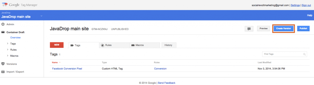 After you’ve added your tags, click, “CREATE VERSION,” in the top right corner. This will store the last revision for you.