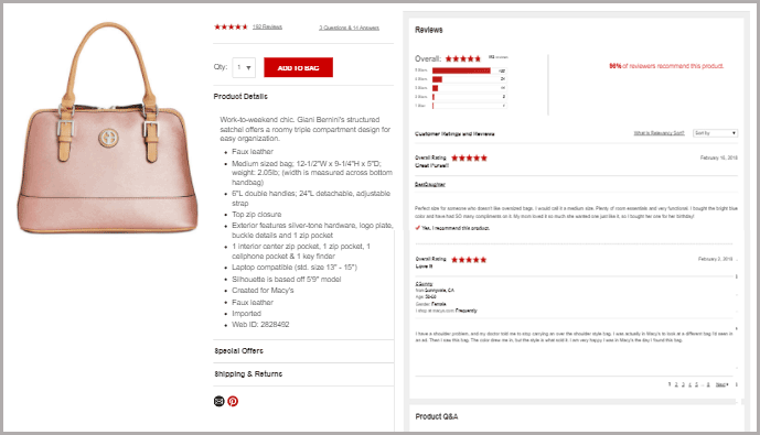 User-generated content could be in different forms. You can enable product reviews, ratings, inquiries and comments on product pages – take for example Macy’s product reviews and Q&A.